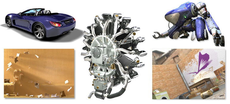 | Car by Kheang Chrun; Engine by Griff Wason; Robot by Kenji Hasegawa; Indoor Scene by Alex Gondarenko; Hallway scene by Catalin Sandru; Ducati image: model by Paul Woodward, render by Tom Grimes; Test Card image by Mike Harris; Multi-Pass rendering images by Paul Woodward; Bug (margin) by Oliver Rohe; VRay outdoor GI image (margin): scene byRichard Rosemann, render by Marcel Barthel; Green Glass (margin): Marcel Barthel; Tank by John Logan; Edan character by Oliver Rohe; Abstract (margin) by Mike Harris; Wooden Room by Marcel Barthel; Airplane by John Logan; Attic by Marcel Barthel based on a scene by JJ Palomo; Boat by Robert Ludlam; Figure (margin) by Marcel Barthel | |||||