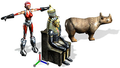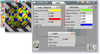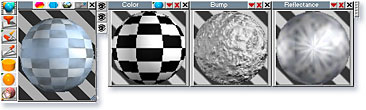 在材質編輯器內,可以即時預覽多階層材質的混合與材質動畫變化。甚至,使用尺寸較大的影像著色,您可以直接改變可調整大小的材質,這會即時顯示變化在場景內物件上。 在 trueSpace 內將材質由顏色 (Color)、透明 (Transparency)、凹凸 (Bump) 與反射 (Reflectance) 四種所構成,並且有獨立的視窗顯示每一種材質樣式,並且在畫面中看到材質混合的效果 (下圖左側的視窗)。