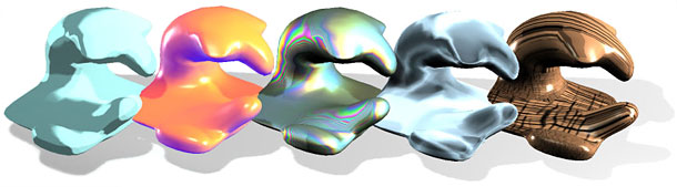 在 DX9 pixel shader 與光源下,trueSpace7 材質更加的靈活,也有著更多的變化。高解析度的網面會轉換為低解析度,並且會自動產生法線貼圖,這些都可以從顯示模式設定選單中選取,而且不會失去任何顯示上的細節。複合的程序化材質,可以從單一的質感樣式中建立,也可由script或再連結編輯器 (Link Editor) 內用滑鼠拖曳連結而成。