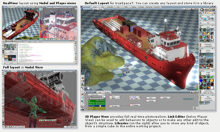 Caligari 是眾多動畫軟體中 3D 直接操控介面的先驅,trueSpace7 使用了第三代的 3D 控制器,讓操作時更加的容易編輯。在同一協同工作的專案中,使用者介面強化且提昇操作的方便性,並且可以根據不同的整合原則,提供數種功能強大與使用者自定的預設版型。 | ||||