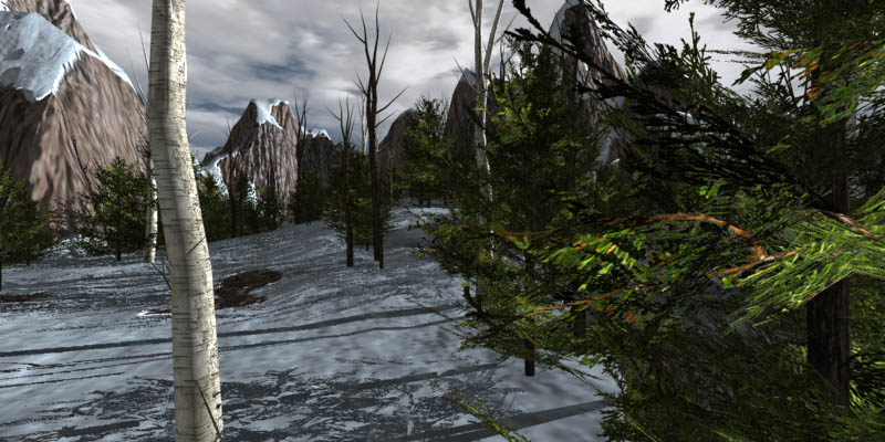 根據使用者輸入的海拔高度及山坡傾斜度,產生地形物件的材質及凹凸貼圖。使用者可以以參數的方式設定覆蓋地表的二種不同的材質,這覆蓋材質可以根據使用者指定的海拔高度及山坡傾斜度準確的貼上地形物件。例如,使用者可以在較平坦的地形物件上貼上雪地,或是描繪出高海拔雪頂。