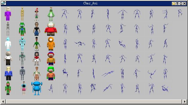 動作資料庫 Char_Ani 內有 23 組人物資料及 50 組人物動畫模型資料庫,利用場景編輯器,輕易的將人物套上逼真精采的各式動作。相關使用說明敬請參閱 Support Pack 1 使用說明