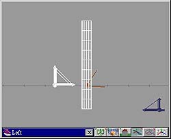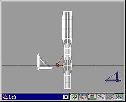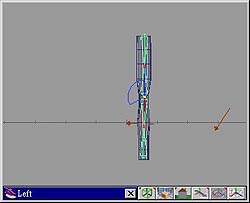 用滑鼠再圓弧的地方拉大圓弧,再拉缺角的地方調整圓弧的角度,有就是活動的範圍 (如圖15), 這個用法和 Truespace 3 的 1D連結一樣. 再來將 Bone 與手臂結合,用 Attach Skin to Skeleton ,其圖示為 (圖16) 最右邊那個結合後,將滑鼠移到小臂拉看看, 是否如 (圖17) 所示,且只能再我們設的範圍活動.