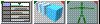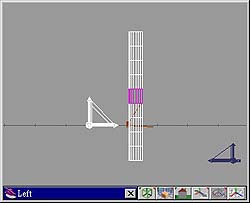 Bone (骨骼)系統雖然 Bone 的功能在之前的文章有人講過,不過在這兒介紹的不一樣. 當然首先來做一個 Nurb Object,再來套上骨骼 (Bone) 在這兒要介紹的是手臂的彎曲製作(做手掌很一般). 我們先放入一個16X10的圓柱體,再縮放成手臂大概的比例如(圖七)所示再來順便介紹一下 Truespace 4 新增的選取工具 Select usingRectangle,這個功能目前 只能框選"面",無法框選"點",因為 Maya 或 LightWave 3D 都可以框選"點",所以我建議 代理商向原作者建議一下,這樣 Truespace 會比較完美. 好像有點偏離主題了,我們用滑鼠 右鍵按 Select usingRectangle 的圖示,將 backside 打勾,這樣連另外一面都能選的到, Select usingRectangle 的圖示如(圖八)最左邊那個紅色的框框.