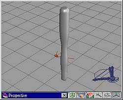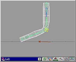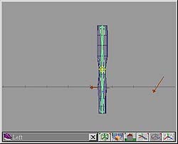 再來用 Nurbs object 把手臂變成 Nurbs 物件如 (圖11)為了操作方便,我們再按一下 Nurbs object 圖示,還原成原來的物件,等練習一遍以後再用 Nurbs. 接下來是重頭戲 Bone 的賦予,我們用 Build Skeleton 工具,在手軸的位置點取一下Bone會自動設定為 兩截如(圖12)所示: