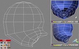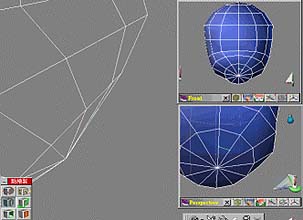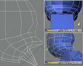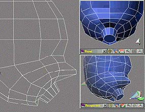 調整如 (圖17) 相關點的位置,記得點與點的連線要平順,且不要移動離原來的位置太遠, 這會影響到人頭臉部的平順度。 現在是最精彩的地方了,先選取嘴巴前面的多邊形 (圖18),然後按下延展,再將延展出的面縮小 (點縮放)。結果如 (圖19)。