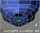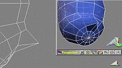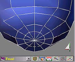 | page 5-3 適用版本:trueSpace4.0以上 發表日期:2000.2.17 再來我們要在最下面的圓內多加幾個多邊形面 (要作嘴巴),SO 按下點繪製的新增邊線。在前視 圖中可能無法下第一個點,所以我們可以在前視圖或透視圖中下第一個點 (圖11)。在作第二點的 連接時,儘量與旁邊的邊線平行,這樣之後就不用再去調整了 (但也不必太精確)。完成後如 (圖12)。