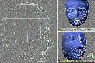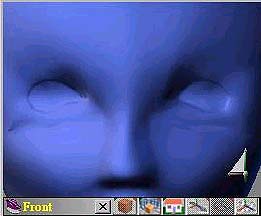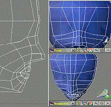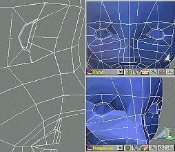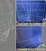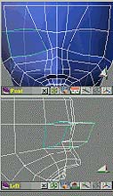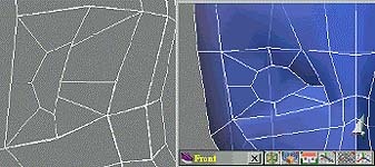 | page 5-5 適用版本:trueSpace4.0以上 發表日期:2000.2.17 接下來我們要做眼睛,不過眼睛部份的可供編輯的點似乎少了點,所以我們在如 (圖35) 的地方按 點繪製/新增頂點並移動到相關位置 (加點是等一下讓眼睛更好編輯)。