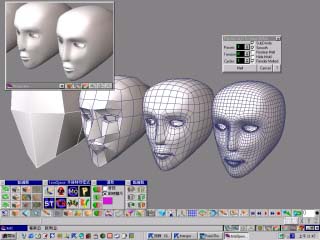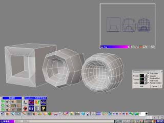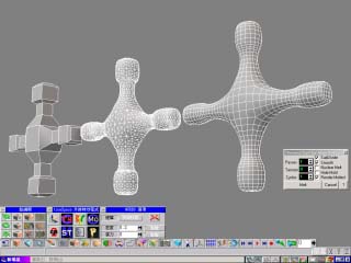 這是 Nendo 將左邊鞋底的邊緣硬化之後產生右邊鞋子的造型 如果將使用 ThermoClay2 製作模型和 Nurbs Object 來比較的話,ThermoClay2 有一個優 勢,那就是圓化處理後所產生的面數比 Nurbs Object 少很多,也就是說將來在製作動畫可 以非常的快,如果使用者的技術更成熟一些的話,可能會以更少的面數產生更精緻的模型 這要端看使用者的功力而定,厲害的高手大概只需執行兩次 ThermoClay2 就能完成一個 模型了!! 中間為 Nurbs Object 的效果,右邊則為ThermoClay2,我們可以很清楚的看出當中面數的差異 。 |