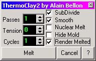 右邊的選項則解釋為: 呵呵!其實我們真正用的到的功能只有 Subdivide 和 Smooth 兩個,其它的選項就自行斟酌情 形來使用吧,筆者習慣只將這兩個功能和 Render Melted 打開來使用,如下圖,因為這樣所產 生的效果和 Nendo 的 Smooth 功能類似,筆者比較容易預期圓滑後的效果!! 看完了上面的介紹,您是否已經開始對 ThermoClay2