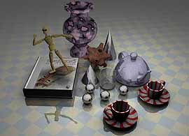 影像式背景 使用影像檔案做為環景的方式,唯其光源所使用的影像最好使用無接縫的影像圖片;並且其在顯示背景的狀態下,光源與環境是以球體的方式顯示,故光源的尺寸不宜太小,並且能夠將攝影機包含在內。此效果請參照前面所製作的圖片。 基本的方式 若是您不加入任何的環景影像檔案,其與基本的光源使用無異,且比一般的光源效果更佳。其環景影像面板中的設定如前所述,唯當您不設定環景影像的檔案時,顯示環境的選項最好不要核取,否則當光源的尺寸較小會顯示出環境影像光源的球體。因為沒有環景影像,所以光源強對最好不要太大。 如圖 24 及 25,畫面中只有使用一盞環景影像光源,可以很明顯看出使用環景影像光源對於金屬物體的反射非常的自然。 |