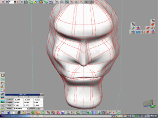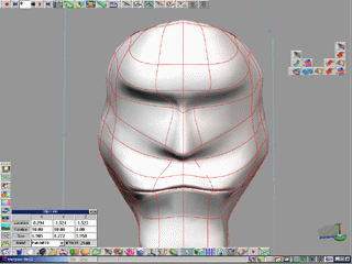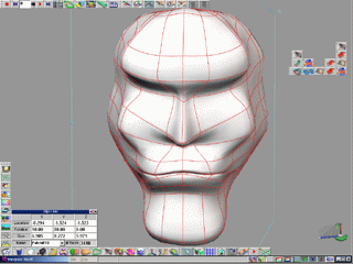在接下來的步驟中,我們要將模型做更細部的編輯,由於 NURBS 不比 Polygons 多邊形物件,曲線之間的位置如果距離太過於相近,容易產生皺摺的現象,需特別注意一下,如圖(Pic17)所示,我們使用 Refine Patch 新增了數條編輯上所需的曲線包含鼻樑上的一條以幾眼睛兩側...