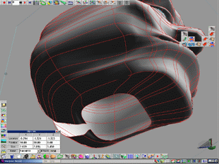 接著我們選取下端開口處的曲線,使用延展工具也就是 Extrude Tools 將它延展出來,如圖(Pic32)所示. 注意不要延展太大的距離,不然有可能會造成下巴部位太過於凹陷,因為這是 NURBS ,所以一竊必須以曲線作考量!