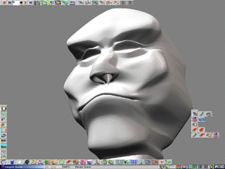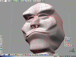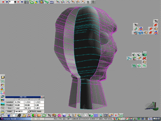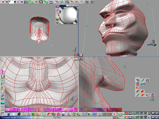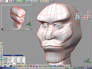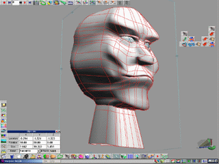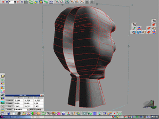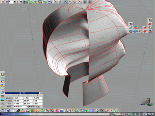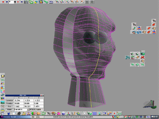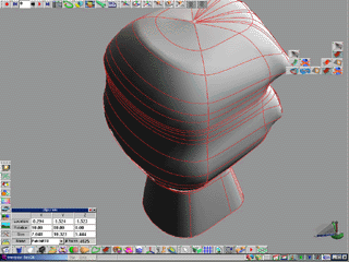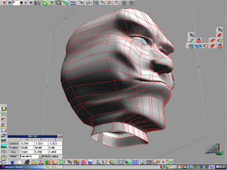 我們還可以讓這個模型更精緻一些,只需要多 Refine Patch 幾條曲線就可了,不過越複雜的曲線,系統也需要負擔更大,筆者為了使用Truespace 5 的 NURBS 系統,最後將整台電腦都換了,連顯示卡都是經過修改而達到最佳化的,以前的 P pro 200 根本跑不動 Truespace 5 的 NURBS ... 圖(Pic40)是使用 Refine Patch 增加更多的曲線並使用點編輯來拉出鼻孔以及將眼睛作更細緻的處理.