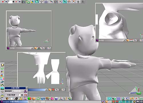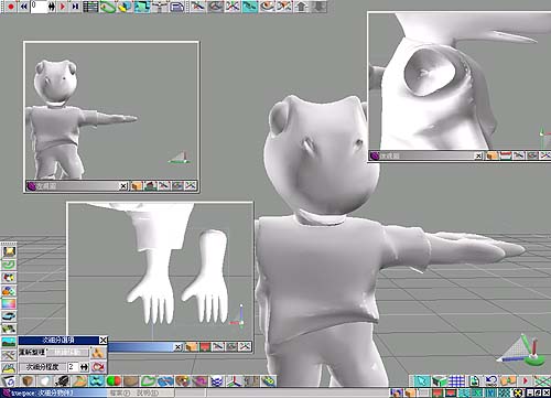 身體部份(二)17. 建立一個正方體,並擺在袖口,利用延展的方式延展出一隻手臂,延展至手掌時,利用新增邊線工具在端面畫三條線,再將各個獨立的面做延展,生出手指 (如圖 27),接下來再複製一隻手臂,然後再次細分物件按鈕上按下滑鼠右鍵,會出現一個“次細分選項”(如圖 28),接著按下“從次細分物件移除控制網面”按鈕,再按下確定,手臂的次細分狀態便不見了 (如圖29),按下鏡射之後移至對稱的位置,再按下次細分物件按鈕便可 (如圖30)