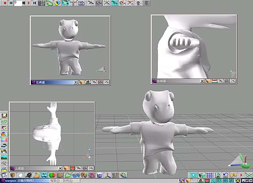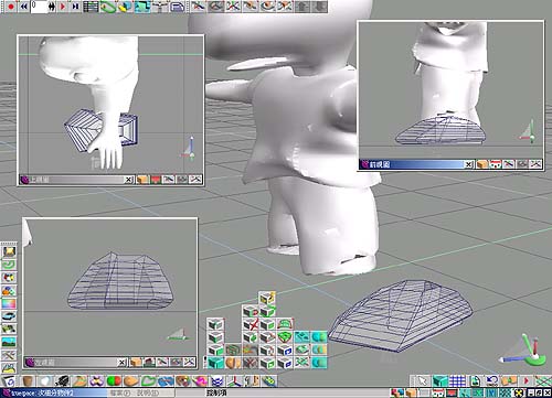 19. 將它向上延展,延展多次一點,將腳的形狀延展出來,再去做點編輯(如圖32),先將它複製一份之後做鏡射,然後再一起做次細分,將他們擺到褲子底下便大公告成了(如圖33)