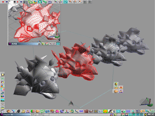 Truespace 5 的模型變形功能有物件變形,如圖(Pic13)所示,這個功能能讓我麼在模型上任意新增所需的變形曲線,使用起來有點像捏黏土的感覺! 雕朔表面,如圖(Pic14)所示,我們可以在模型的任意處新增雕朔點來推拉模型. 朔形,如圖(Pic15)所示,我麼可以藉由這個功能利用球體之類的基本工具來擴張模型的表面,擴張出來的範圍可以在動作之前設定精細程度,除此之外,我們可以設定欲朔形的範圍為物件上的某些面或整個物件,好用極了!!
