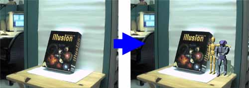 擺設模型我們擺設二個模型並調整其姿勢,這二個模型的陰影會投射在前面擺設的平面模型上。如圖5,為方便顯示,將其場景實體繪製調整為半透明顯示。 |
