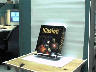 在本處為方便利用地面網格來對準畫面中的線段,所以我將地面的網格數減少一點。對位後的畫面,如圖3。您可以從網格的線段中看出其與桌面成平行,且線段與角度上都能夠對齊。