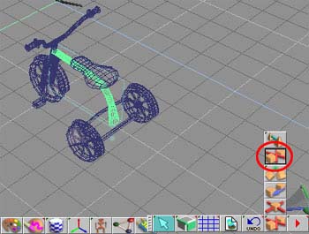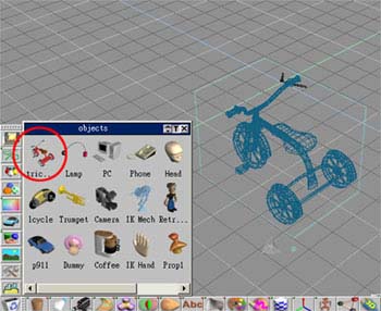 有些物體在建立時就已經有連結關係如文字模型,我們就可以利用上面二個工具來解除連結關係。現在我們加入一個由trueSpace 提供的"腳踏車"物體,此時您可以按下「分解階層與 IK 分肢」,它會將所有的連結都取消,然後您就可以依據需要重新進行連結。
