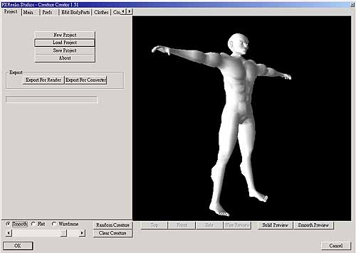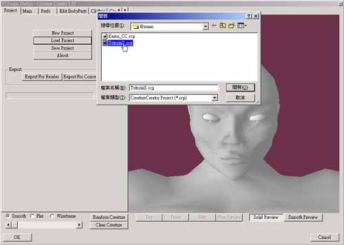 點選此處,您可以瀏覽更多的 Creature Creator 作品。 開始建構接下來簡單介紹Creature Creator的操作,以及如何建構模型。目前我們使用的是Creature Creator for trueSpace5 版本,不管您選擇何種版本,基本操作都差不多。 安裝完成後,在畫面上會出現一個 Creature Creator 的圖示,按下圖示即可開啟它。我們先載入一個教學模型,先在 Project 標籤內按下「Load Project」按鈕,在開啟對話方塊中選擇 “Tutorial1.ccp” 檔案,這樣就載入一個 Creature Creator 模型,如圖 1。