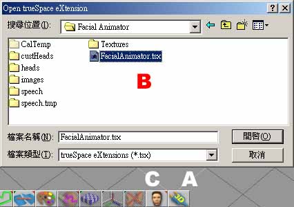在本文中我們針對幾項特點為您介紹。 安裝當您安裝完 trueSpace5.2 正式版或 15 天試用版,請點選下圖 A 中的 "Install new trueSpace eXtension" 圖示按鈕;即開啟圖 B 的 "Open trueSpace eXtension" 對話框,Facial Animator 是安裝在 trueSpace5 目錄 \tsx\Facial Animator\ 內,請選擇其內的 FacialAnimator.tsx 。接著便會在您的工具列上出現,如圖 C 處的圖示。點選此圖示,便可執行 Facial Animator 這個工具,並開啟如下方圖 1 的面板。