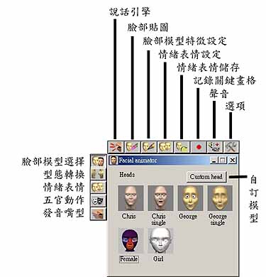Facial Animator 的基本原理是使用模型上的特徵對應點,這些特徵就是臉部的五官位置,如眼角、鼻尖、嘴角、臉頰…等位置,再透過說話引擎,讓你的模型根據特徵即可達到表情或是說話的動畫。完全只需要使用一組臉部的模型,不需製作各式表情;同時可以套用所有的情緒表情、五官動作或是發音嘴型在各種不同的臉部模型上。 Facial Animator 還可以讓你用聲音檔或文字輸入的方式,嘰哩呱啦的說一大段話。呵呵!!以往花個幾天幾夜才可以完成的幾”秒”的動畫,現在用 Facial Animator 一下子可以完成一大段,注意喔,是用 ”分鐘” 計。 Facial Animator 主要特點: