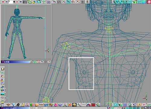 雖然已經都調整為肌肉的屬性,但是其還是會有肌肉擠壓上的問題。所以我們還是必須更進一步的解決此問題。 Skill : 增加 IK 連結點增加一個 IK 連結點,就相當於增加了骨骼。每一根骨骼都分配到皮膚 (頂點) 作為控制,所以你只要適當的加入 IK 控制點,即可擺脫皮膚拉扯的困擾了。 3. 進入「編輯骨架」模式,我們在圖 25 的位置加上一個 IK 連結點,選擇框取的工具加入 IK 連結點 (需搭配 Ctrl 鍵)。