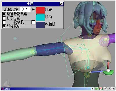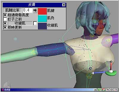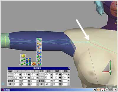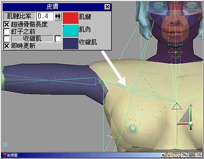 Skill : 檢查骨骼與模型網面1. 我們進入「編輯肌腱」模式,如圖 23,可以發現此 IK 連結點的二端皮膚屬性分別為:淺藍色的頂點位置為手臂,屬性為肌肉;深藍色的頂點位置為胸部,屬性為收縮肌。當肌肉與收縮肌產生角度上的變化時,也就是手臂與胸部間產生夾角時。