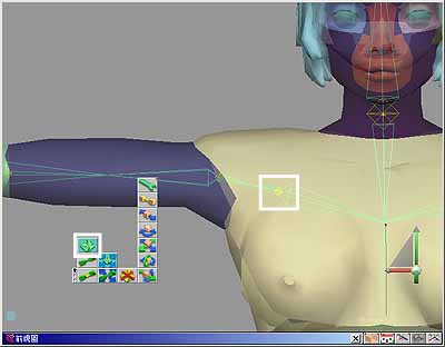 4. 再次進入「編輯肌腱」的模式,檢查此 IK 控制點及二端骨骼所控制的皮膚頂點,如圖 26。我們可以看出幾乎整個左上角的胸部頂點,都在此 IK 控制點的控制下。