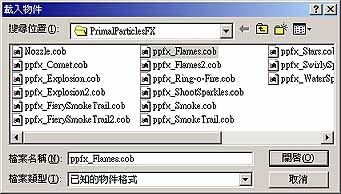 火焰特效 – Primal Particles FXPrimal Particles FX (簡稱 PPFX) 這一套號稱是 trueSpace 上的 illusion,作用與 illusion 類似,噴出具有材質的平面;但是其所噴出的平面永遠都會面對視窗或鏡頭,所以您可以自由的運鏡,甚至可以將攝影機環繞燃燒的火焰周圍。可以創造出如同 illusion 一般的火焰、煙塵、爆破、煙火…等效果;所有的效果,如分子噴射、分子影像、顏色…都可以自訂。 Primal Particles FX、PPFX 內建於 fxPak 中 同時 PPFX 還提供數種現成的資料庫供您使用。PPFX 的效果是以 trueSpace的物件在場景中呈現,存檔時其是儲存成特殊的 .cob 格式。與 illusion 或是一般 Particles 系統,相同的是其具有 Emitter 與 Particles 的觀念。 Emitter:發射器,所噴出的內容為分子 (Particles),故一組 Emitter 內可以有好幾種不同的 Particles。 Particle:分子,每一組分子都負責一個 Emitter中的一項效果。 本文中我們以其現有的資料庫樣式作為範例。 1. 載入一組 Emitter 物件 – ppfx_Flames.cob,如圖 28。這是一組火焰燃燒的 Emitter。