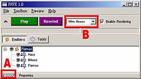 3. 開啟 Emitter 的工作面板,如圖 30。點下圖 30A 處可展開屬性 (Properties)。 4. 圖 30B 處可選擇預覽的分子圖示,按下 Play 件可以看到其預覽的效果,如圖 31 所示。共有五種預覽模式,Dots、Wire Boxes、Wire Circles、Solid Boxes 及 Solid Circles。