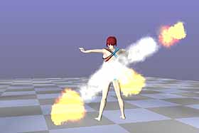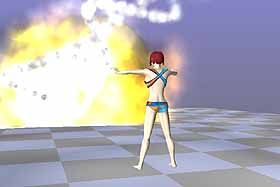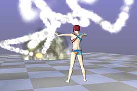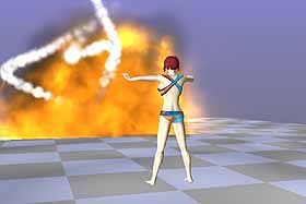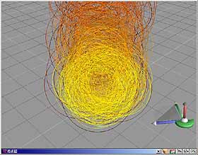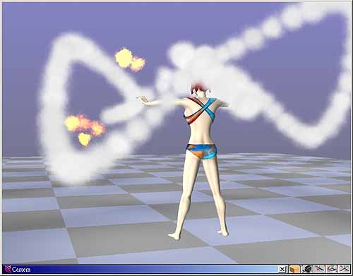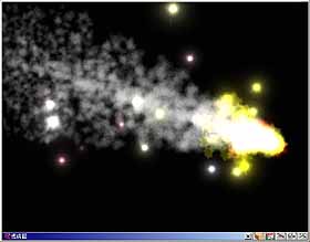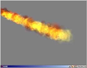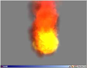5. 這是一個火球的效果,此 Emitter 共分為三個分子 – Haze、Billows 及 Flames 分子,著色後場景如圖 32。Emitter 物件也可以像一般的物件設定動畫,著色後如圖 33。