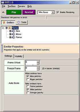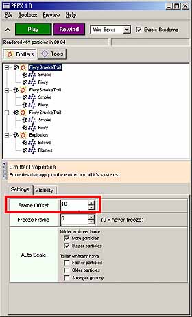 10. 其中最後的爆炸使用 Explosion 的 Emitter,可以從 Emitter 的 Frame Offset 設定 Emitter 的延遲時間,到正確的時間再產生爆炸,設定如圖 41。