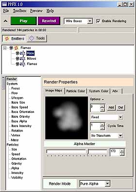 下載本範例動態影片 ik_ani.zip (約 1.9mb) Primal Particles FX 本身還有許多的效果可以加入,如風力、彈跳、重力…等影響 Emitter 所噴出的 Particles。使用 PPFX 還有一個好處,就是其使用影像分子的原理,其運算速度很快。 結語這幾樣小工具還有許許多多巧妙的地方,礙於篇幅無法詳細的說明及介紹。相信愛好 trueSpace 的人一定可以將其發揮的淋漓盡致。 相關資源本文內的相關試用外掛程式下載請至 trueSpace
