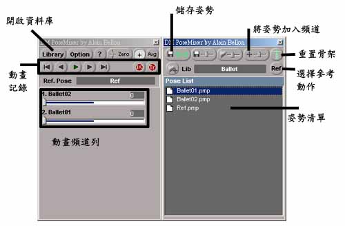 5. 在資料庫中的 Ref.pmp 為參考動作,芭蕾動作分別為 Ballet01.pmp 及 Ballet02.pmp,我們將其加入到資料庫的頻道列中,如圖 5