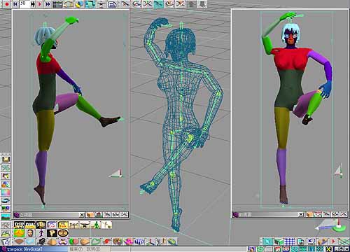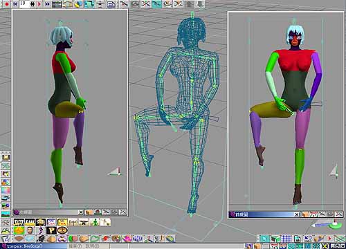 9. 因為先前所建立的資料庫並非套上模型後調整的動作,所以或多或少會有一些細部的動作不太理想,但是可以事後再調整。 PoseMixer 最大的特色在於其動作可以自定資料庫,而且其動作的幅度可以微調。搭配上 aniPak 中的 Skeletool 或 Puppeteer 這些工具調整姿勢,這對於常用骨架進行動畫的朋友們會非常的方便。 |