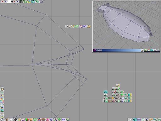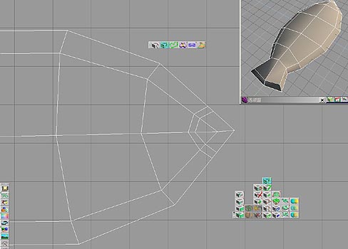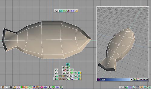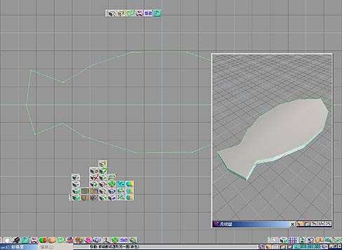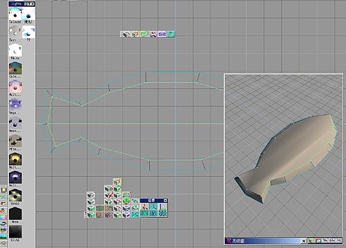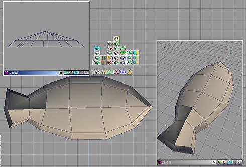 在此您需注意到一點,當您執行多邊形繪製工具時,例如您在母視窗中由上往下連結各個頂點,當您想要做連接另外一段新的連接點時,必須按一下空白鍵或物件工具,來做取消執行多邊形繪製工具連接點的動作,之後再做連接另外一段新的連接點。想要做新的連接動作,就再按一次多邊形繪製工具按鈕,重覆此動作來完成此步驟的作業. step6選取如圖14的這一組頂點,利用浮動工具列上的點移動功能,將點移動至如圖14所示,等於是將魚身的側邊,修正為正確的魚身曲線.如圖14,我們新增一個左視圖子視窗,來清楚的辨識魚身側面點移動的情形.