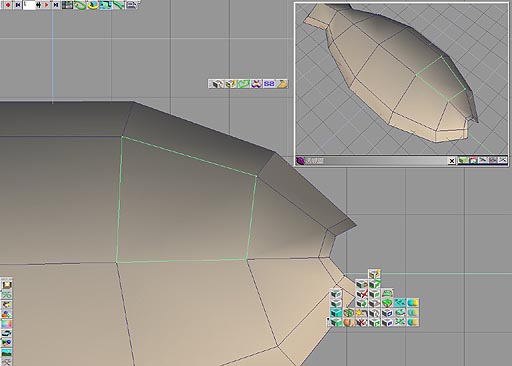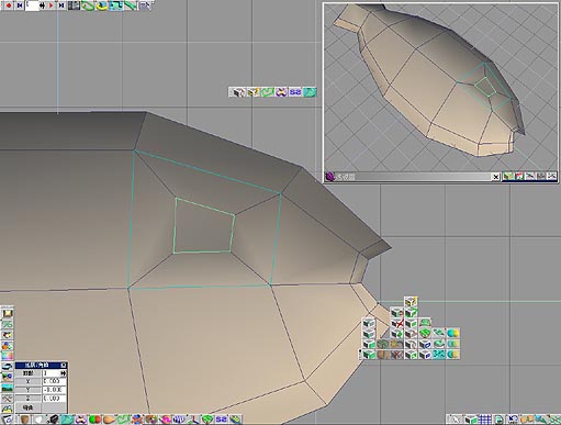 step8再來是眼睛的部分,首先將游標移到魚形物件的上方,按一下右鍵,即會彈出多邊形編輯的浮動工具列。點選點編輯:選取面的功能,用以選取如圖18所示此此位置上的面.