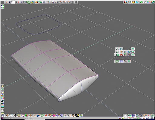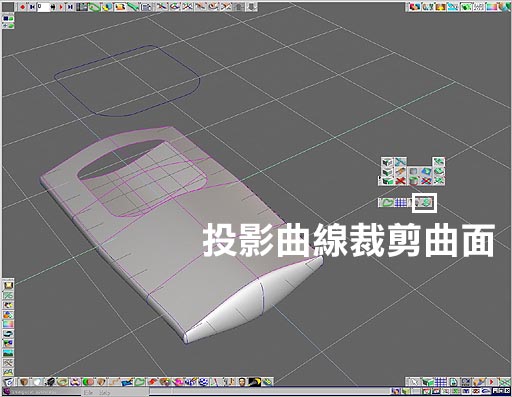 投影曲線裁剪曲面 curve to patch projection在 Truespace6.0 當中內建有(投影曲線裁剪曲面)curve to patch projection 的工具,以及配合(複製曲面上的曲線或裁剪曲線)curve from edge 的工具,對 truespace 的 nurbs 曲面編輯有實質的幫助. 1. 如圖 09 可以看出執行(投影曲線裁剪曲面)curve to patch projection 的工具,其做法是按下工具圖示之後,先點選曲線後點選欲投影裁剪的曲面,即可自動完成投影曲線加上裁剪曲面的作用.