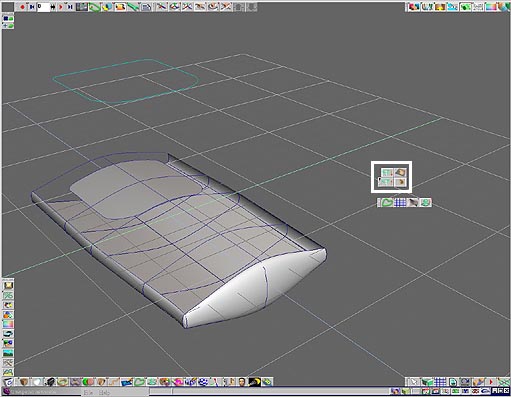4. 在 nurbs 曲面上做完各種如 bland surface(接合曲面)、stitch tool(縫合曲面)、skin surface(同其他軟體的loft surface)或 extrude fromedge 編輯等…truespace 會在編輯過後自動將曲面做連結的動作.因此現在選擇剛剛的 nurbs 曲面,按下鍵盤上的向下鍵,在以左右鍵選擇各個階層底下的曲面,如圖 13 選擇剛剛延展的曲面,使用縮放物件的工具將它縮小一些.