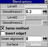 6. 如圖 15 當我們選完第二條欲接合的邊線,曲面及自動接合完成.在預設的情形底下,接合表面參數面板中的 smoothness 值為 0.5,調整為 0.25 較為適當.level1 與 level2 分別為兩個面接合邊緣的調整值,如選擇 same method(相同方式)兩個接合邊緣即可以同樣的值為接合的平滑程度.另外在 surface 選項如選擇 better 會有較佳的平滑表面.參數面板如圖 16.