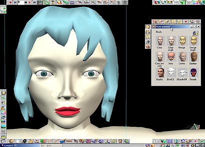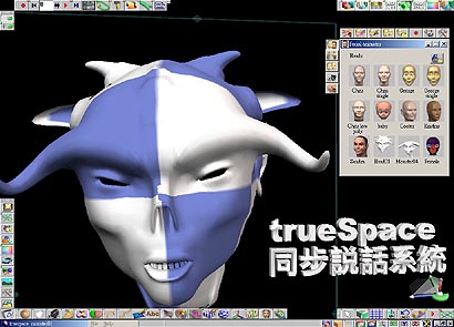 對於想要製作臉部表情動畫的人而言,trueSpace6 提供了一個先進的工具 - 劃時代的 Facial Animator 1.2 版,表情動畫最佳解決方案,此為 trueSpace6 內建功能。Facial Animator 對於想要利用 TTS (Text to Speech) 的人來說,非常的方便,如圖 8 及 9,無論是人物或是怪獸,都可以輕易的說話及製作各種表情。此項功能在前幾期雖然已經說明過了,此處我還是稍作說明一下。