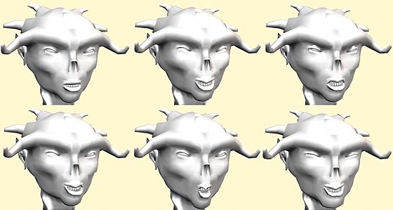 改版後表情的辨識率更佳的精準。在自訂頭部模型時,若是您的頭部模型本身是左右對稱 (symmetry) 的話,您更可以在特徵點編輯時啟用此選項,相信我,這會讓您方便很多。同時新版本的 Facial Animator,可以支援次細分物件了。迷人吧!!對於喜歡做低解析度模型的朋友而言,這真是個大大的福音。如圖 10 及 11,製作各式的表情動畫。