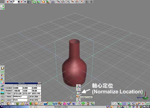 動畫:物件變形變形塑管並不是一個新工具,但是此工具非常的好用,依舊受到 trueSpace 用戶的喜愛,可以讓大家製作出相當有趣的效果。 11. 先將前述步驟所製作的瓶子位置歸零,使用軸心定位 (Normalize Location) 工具可以將物件重置到 (0,0,0) 的位置,如圖 11;或是可以從物件資訊 (object info) 面板中,用手動的方式輸入。