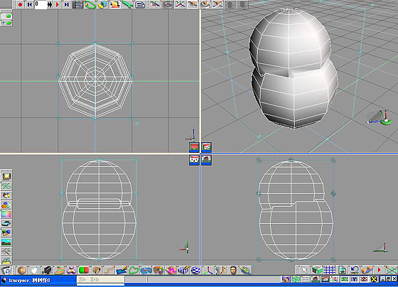 | 1. 建立一個橫節數10縱節數8的球體,按下Ctrl+C在原地複製一個球體,再將新的球體向上移動並縮小,按下物件聯集按鈕,將兩個球體聯集在一起,如圖。