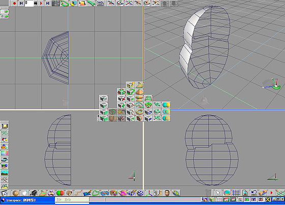 2. 按下點編輯;點的按鈕,再用矩形選擇工具將球體的右半邊所有的點給選取起來,按下消除頂點,將右半邊刪除掉,然後再按下刪除面的按鈕,選取中間的面,將其刪除,如圖。
