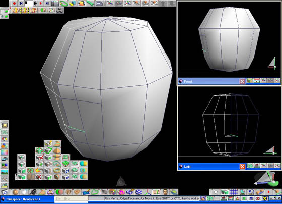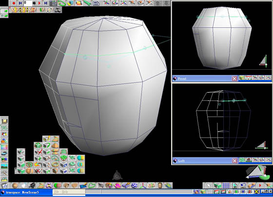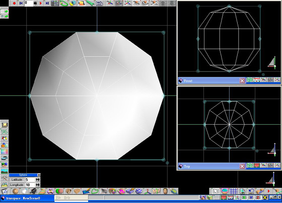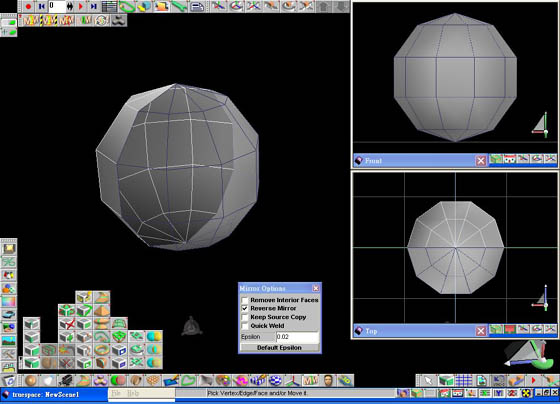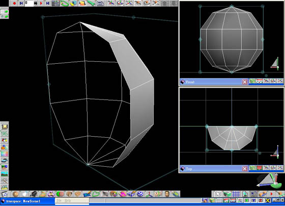 請注意:為維持畫面的一致性,我們儘量使用最大的圖片,故本範例您在網路上觀看時,窄頻的使用者會有速度較慢的情形,敬請見諒。 開始製作1. 開啟 trueSpace6 之後,請建立一個橫節數 5,縱節數 10 的球體,如圖。 2. 對圓球按下滑鼠右鍵進入編輯編輯狀態,按下矩形選取工具 (Select using Rectangle),將上視圖當中,上半部的面給選取起來,,按下消除頂點 (Erase Vertices) 按鈕,上半部的面便會消除,接著再按下刪除面 (delete Face),選擇圓球中間的面,將中間的面刪除掉,如圖。 3. 點選正視圖中,面對自己的面,對 Mirror Modeler (鏡射模型) 按鈕按下右鍵,如圖5,叫出 Mirror Option (鏡射選項) 對話方塊,將 Reverse Mirror 打勾,如圖。 請注意:本步驟您可以無須如此操作,只要用點編輯選取一個面並啟用 Mirror Modeler,則會根據此一選取面做為鏡射面。 這樣鏡射出來的模型才是我們要的位置,接著按下鏡射模型 (Mirror Modeler) 按鈕,模型的右半邊便出現了,如圖。 4. 再進入點編輯模式,用矩形選取工具 (Select using Rectangle),將圓球上的點做些調整,讓圓球較符合頭形。 5. 用新增邊線 (Add Edges),衡量一下鼻子的寬度,新增一條由圓頂到圓底的邊線,約略在眼睛的部位新增一條線,在鼻子底端的地方也新增一條線,然後在鼻翼到鼻尖之間也畫一條線,如圖。 用多邊形切割工具(Polygon Slice)在額頭的地方新增一排邊線,如圖。 |