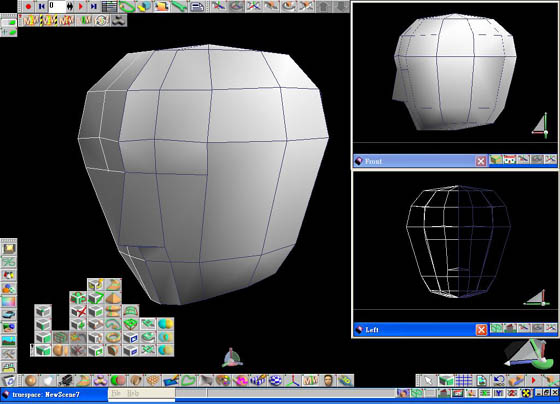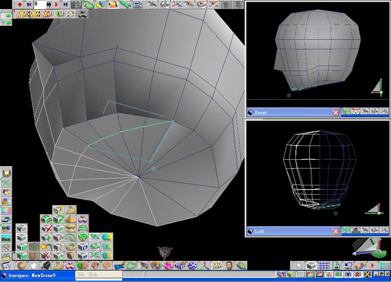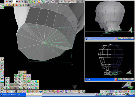 6. 把鼻尖的點往前拉,把鼻翼、嘴角和下巴的點也稍做調整,再把整體臉形做大幅的調整,如圖。 7. 接著在頭部再畫增加一些線,增加面的細緻度,把頭後部稍微往上抬一點。 8. 在下巴的地方畫上一條線,如圖。 把頸部的面選取起來,再按下延展 (Sweep) 按鈕,將面延展出去,如圖。 按下刪除面 (delete Face) 按鈕,再選擇頸部內側的面將它刪除之後再向中間靠近,trueSpace 自動會將中間給黏接起來,如圖。 |
