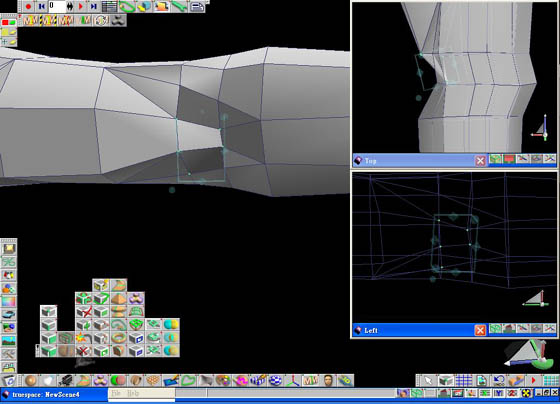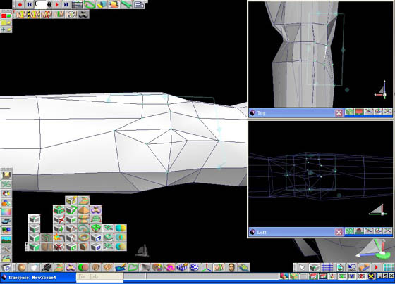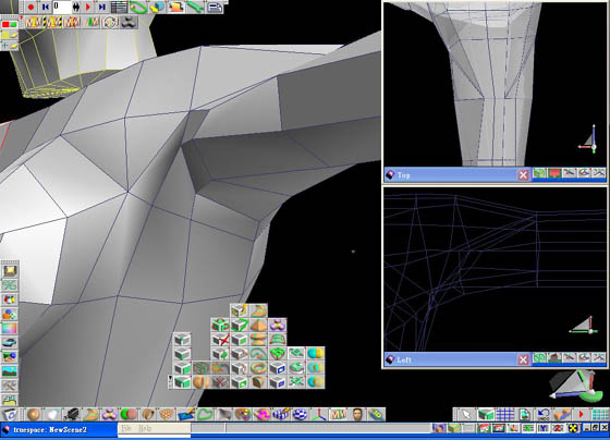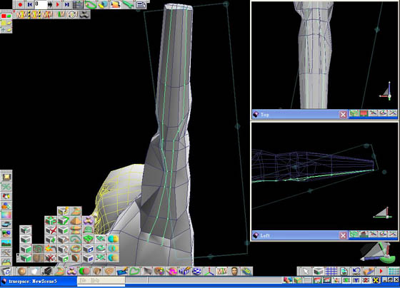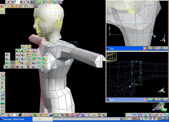 10. 選取手臂的面將它延展5次,將手臂稍微縮小修得圓滑一點,並調整肩膀部分的點,讓線條都合理化,如圖。 11. 接著增加肩膀及腋下的線條,並把多餘的線條刪除掉,這樣做的用意是可以讓手臂上的三角肌較為明顯,如圖。 12. 在手臂上再增加一些線,把上臂二頭肌做出來,若是覺得手臂過短,可以把手臂拉長一下,在手臂彎曲的地方增加兩條線,再稍做調整,如圖,讓上臂二頭肌的尾端更具體一點。 13. 接著把手臂上方的點稍微拉高一點,然後增加兩條線,把肘肌的部分做出來,並把手肘的部分做得詳細一點,,如圖,這樣次細分之後才會更顯得真實。 14. 在手臂上新增兩條線,一方面是修正剛才製作肘肌的線條,並把多餘的線條刪除,一方面是等一下將要製作手掌,所以必須要增加手掌的線條,而線則持續延伸到腋下,如圖。